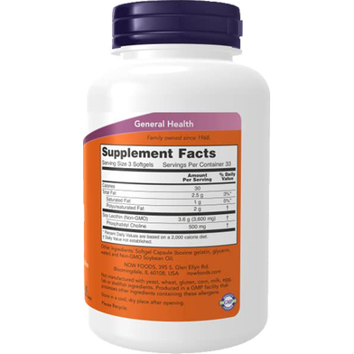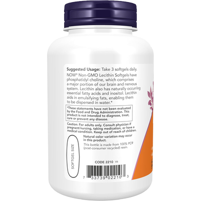 NOW, Lecithin Softgels help support brain and nervous system health. They contain Phosphatidyl Choline, a key component of your brain and nerves. Lecithin also provides essential fatty acids and Inositol. This supplement is non-GMO and Kosher. It is free from yeast, wheat, gluten, soy, corn, milk, egg, fish, and shellfish. It is produced in a GMP facility.