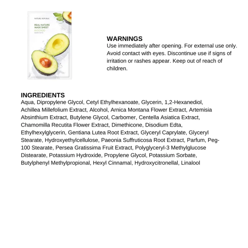 Nature Republic Real Nature Avocado Sheet Mask contains 23mg of Avocado Fruit Extract, which helps the skin to maintain hydration and minimizes damage from free radicals. Avocados contain a monounsaturated fatty acids, which help to heal the dry, irritated and flaky skin.