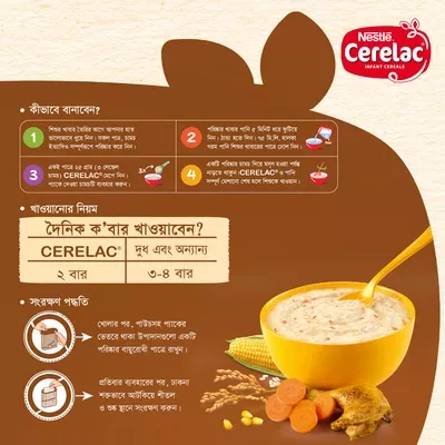 Nestlé CERELAC Rice, Carrot & Chicken with Milk is produced as per the Bangladesh standard for processed cereal-based foods for infants and young children.