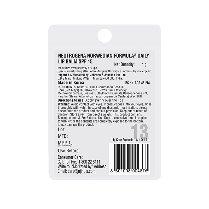 Neutrogena Norwegian Formula Lip Moisturizer SPF15 softens, smoothes and protects dry, chapped lips with no waxy feel. This moisture-enriched formula soothes and conditions your lips, keeping them healthy looking and soft in all weather. This lip balm, suitable for women and men, contains a PABA-free SPF 15 sunblock for added protection from the sun. Leaves lips soft, smooth and moisturised. Apply on your lips as needed. Can be worn alone or with lipstick. The Neutrogena Norwegian Formula Lip Moisturizer SPF 15 is a good lip protection balm. It rejuvenates the lip skin and keeps it healthy and soft. It prevents the lips from drying up which further prevents cracked and chapped lips. The lip balm conditions the lips and keeps them protected and soft all year round, in all weather conditions and seasons. The product has been developed in consultation with dermatologists. It has an SPF of 15 which provides protection from the UV rays of the sun. Its skin enriching formula helps the dry chapped skin to give way to healthy soft skin. It is PABA-free. It does not have any colour, fragrance, or unnecessary additives. It is formulated with the highest quality ingredients like octinoxate, oxybenzone, seed oil, corn oil, castor, ozokerite, petrolatum, beeswax, BHT, stearyl alcohol, ethylhexyl palmitate, and carnauba wax. The product is a translucent natural colour, and can be applied over lipsticks to show the lipstick’s colour. It comes in a plastic twist container and weighs 4 grams. The cap is airtight that helps the product remain leak-free. It is easy to carry in handbags and small purses for use throughout the day. The Neutrogena Norwegian Formula Lip Moisturizer SPF 15 should be applied 15 minutes before exposure to the sun. It needs to be applied liberally to cover the entire lip area. It should be replenished every 2 hours during prolonged exposure to sunny or dry conditions. Within days of continuous use of the product a visible change can be seen to the texture of the skin, and the lips feel soft and healthy. Product Features The product is enriched with SPF 15 for sun protection. It has high-quality ingredients that help rejuvenate the lips. It helps is doing away with dry and chapped skin in all weather conditions.