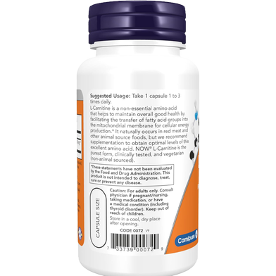 NOW Supplements L-Carnitine 500 mg is a dietary supplement designed to support energy production, fat metabolism, and overall fitness goals. L-Carnitine is an amino acid derivative that plays a crucial role in the transport of fatty acids into the mitochondria, where they are burned for energy. This supplement may be particularly beneficial for individuals looking to enhance exercise performance, improve fat loss, and support overall metabolic health.