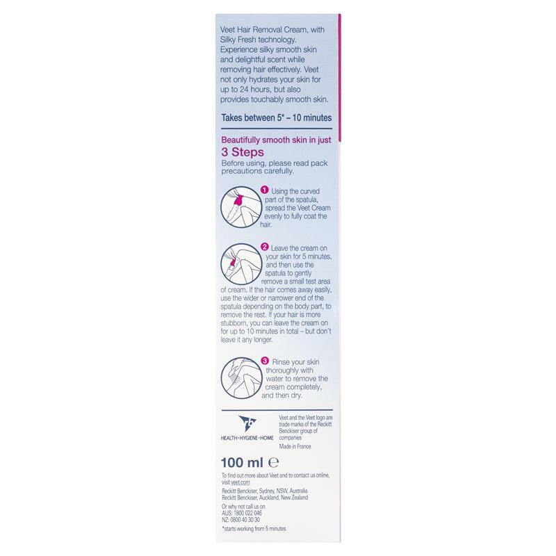 Experience silky smooth and delightfully scented skin with Veet Silk & Fresh™ Hair Removal Cream with flower. While removing hair effectively, Veet not only hydrates your skin for up to 24 hours, but its fragrance technology also ensures that there is no lingering malodour. Now enjoy a pleasant hair removal experience! Beautifully smooth skin in just 3 steps:Before using, please read the pack precautions carefully.Before using, please read pack precautions carefully. Using the curved part of the spatula, spread the Veet Cream evenly to fully coat the hair.Leave the cream on your skin for 3 minutes, and then use the spatula to gently remove a small test area of cream. If the hair comes away easily, use the wider or narrower end of the spatula depending on the body part, to remove the rest. If your hair is more stubborn, you can leave the cream on for up to 6 minutes in total – but don’t leave it any longer.Rinse your skin thoroughly with water to remove the cream completely, and then dry.