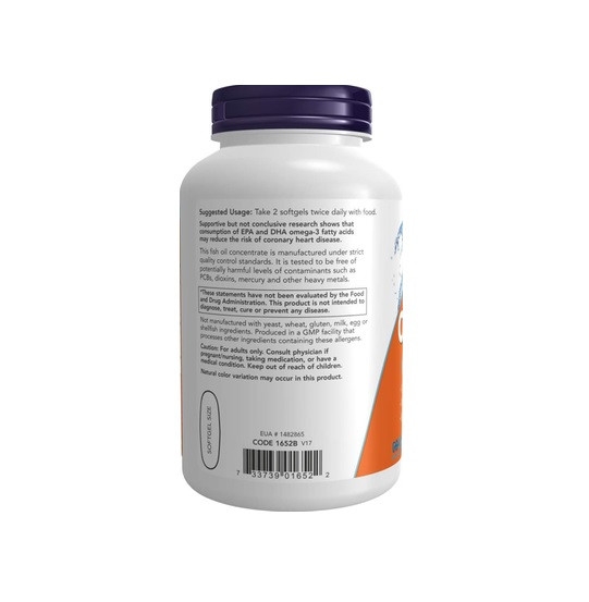 NOW Omega-3 1,000 mg softgels are made of natural fish oil concentrate manufactured under strict quality control standards. This supplement is tested to be free of potentially harmful levels of contaminants such as PCBs, dioxins, mercury, and other heavy metals. Take 2 softgels twice daily with food.