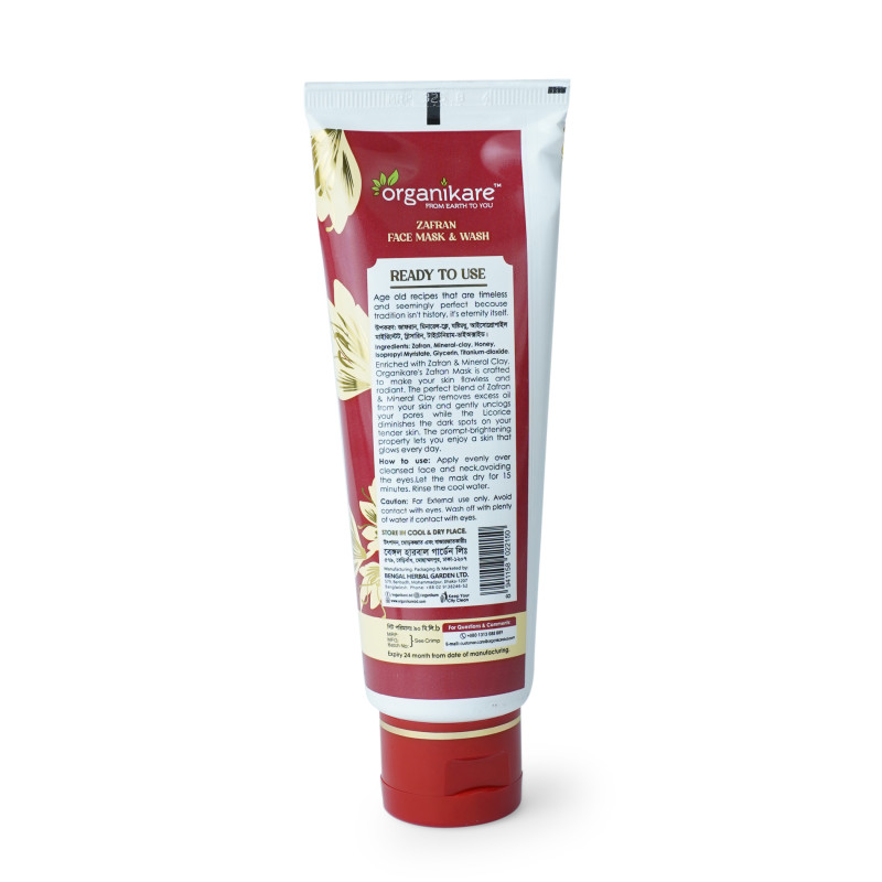 Organikare's Zafran Mask, enhanced with Mineral Clay and Zafran, is designed to leave your skin looking perfect and beautiful. The ideal combination of Mineral Clay and Zafran clears your skin of extra oil and gently unclogs your pores, and the Licorice lightens the dark spots on your delicate skin. With the prompt-brightening feature, you can have glowing skin all the time.