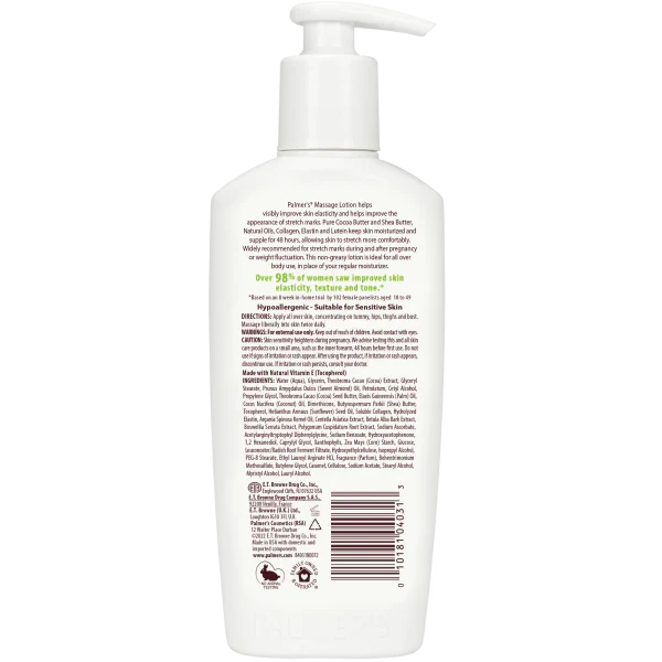 Palmer's Cocoa Butter Formula Massage Lotion helps visibly improve skin elasticity and reduce the appearance of stretch marks. Pure Cocoa Butter and Shea Butter, Natural Oils, Collagen, Elastin, and Lutein keep skin moisturized and supple for 48 hours allowing skin to stretch more easily. Widely recommended for stretch marks during and after pregnancy or weight fluctuation. This non-greasy lotion is ideal for all over body use, in place of your regular moisturizer.