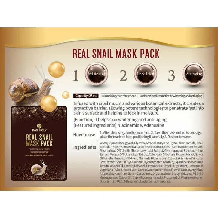 -  Rest for between. Benefits of Real Snail Mask Pack Snail mucin as an anti-aging ingredient is widely popular because of its benefits.