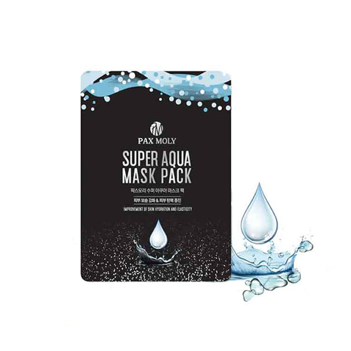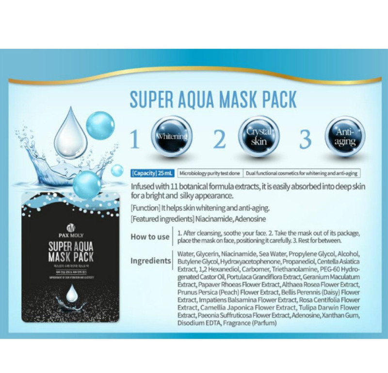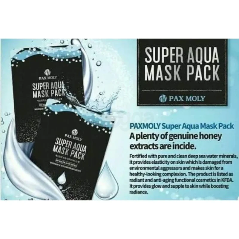 PAX MOLY's Super Aqua Mask Pack. facial mask. It was set on a delicate sheet that was completely saturated with beneficial active substances, such as sea salt, adenosine Asiatica, extracts from day flowers, and Centifolia rose. Effectively and persistently firms, moisturizes, minimizes the appearance of wrinkles, and slows down the aging process. It also regenerates the skin and gives it a radiant, healthy appearance. There is one mask in the packet.