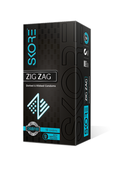 ZigZag Condom with its unique ribbed and dotted texture, in a patented ZigZag pattern
