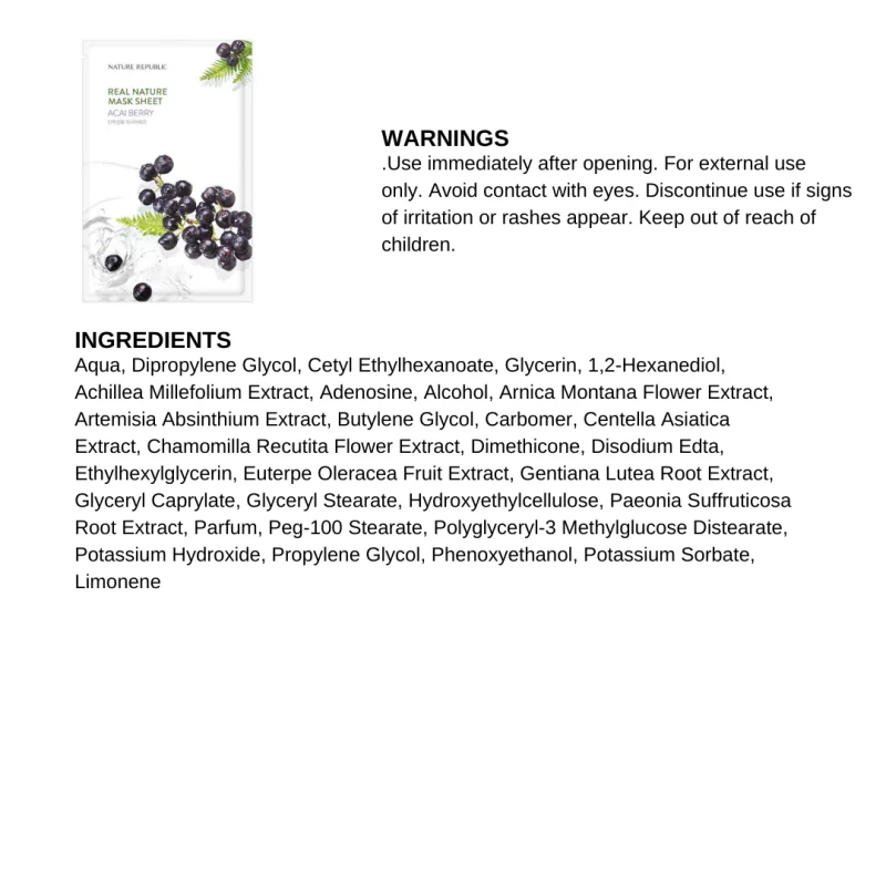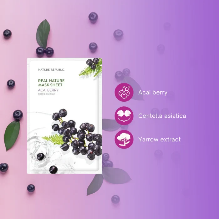 A refreshing sheet mask made with acai berry extract that boosts moisture for healthy looking skin.