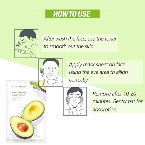 Nature Republic Real Nature Avocado Sheet Mask contains 23mg of Avocado Fruit Extract, which helps the skin to maintain hydration and minimizes damage from free radicals. Avocados contain a monounsaturated fatty acids, which help to heal the dry, irritated and flaky skin.