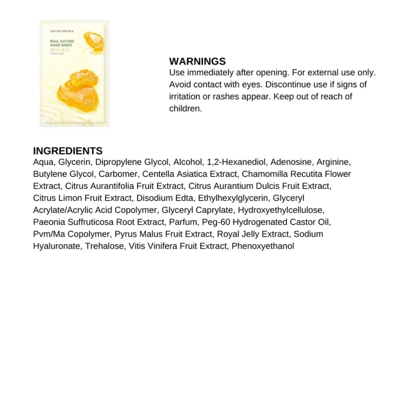 Royal jelly-based hydrating sheet mask that gives skin intense hydration and nourishment.