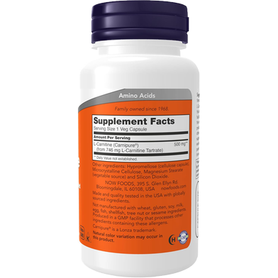 NOW Supplements L-Carnitine 500 mg is a dietary supplement designed to support energy production, fat metabolism, and overall fitness goals. L-Carnitine is an amino acid derivative that plays a crucial role in the transport of fatty acids into the mitochondria, where they are burned for energy. This supplement may be particularly beneficial for individuals looking to enhance exercise performance, improve fat loss, and support overall metabolic health.