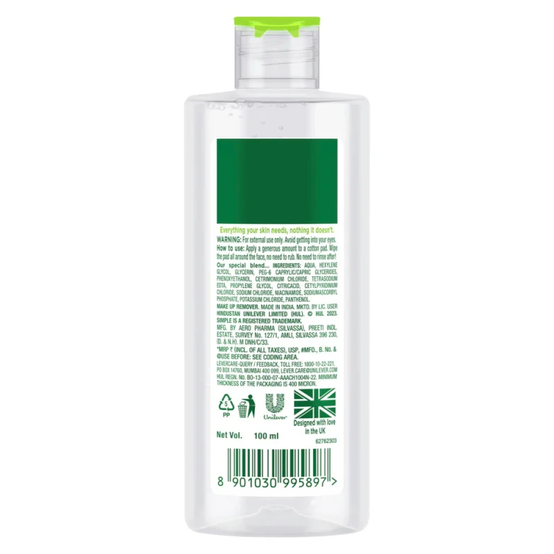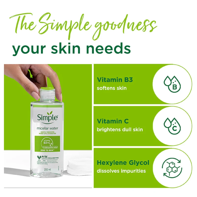 We believe in continuously working to be kinder to the planet, so our Kind to Skin Micellar Water is vegan and Simple is certified cruelty-free by PETA, we don’t test on animals anywhere in the world! Our Micellar Water is also made with a 100% post-consumer recycled (PCR) plastic bottle that is 100% recyclable with its lid!