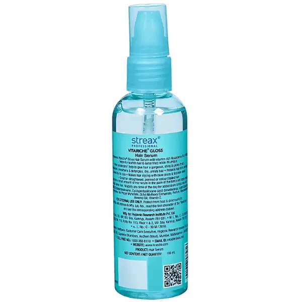 Streax Professional Vitariche Gloss Hair Serum will give you a stunning salon-fresh look. Its unique combination of ingredients, including Macadamia Oil and Vitamin E, helps nourish, smooth, and transform your hair strands, leaving them frizz-free, while shine enhancers give you shiny, sleek hair.