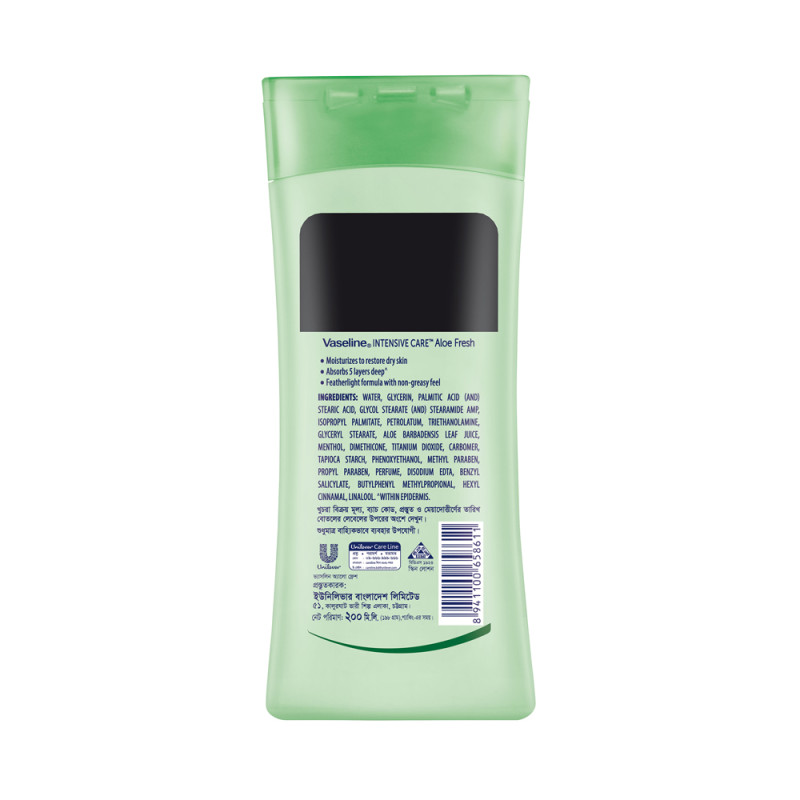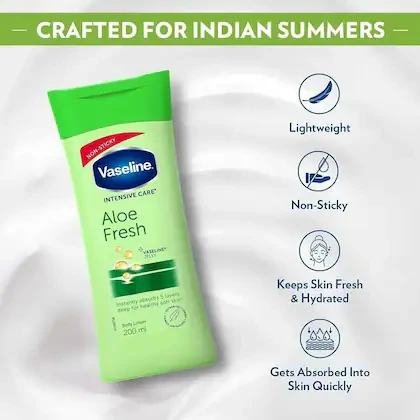 Body can lose upto half a litre of water everyday - leaving skin dehydrated. Dehydrated skin not only looks dull & unhealthy, but also becomes prone to skin infections due to external irritants. Vaseline® Intensive Care Aloe Fresh – with 100% pure aloe vera extracts & microdroplets of Vaseline jelly, restores skin’s moisture & helps maintain 24 hour hydration in skin. Aloe vera has long been used as a home ready to deal with dry flaky skin. It’s believed to have soothing properties to restore smooth supple skin and is effective at improving skin hydration. Aloe vera is an effective skin-conditioning which calms the skin and leaves it feeling deeply moisturized. The droplets of Vaseline® Jelly creates an extra layer of protection, preventing moisture from escaping and helping aid your skin’s natural recovery process. Vaseline Intensive Care Aloe Fresh lotion helps rejuvenates dry skin even in harsh summers. It is a light lotion, that absorbs fast for a non-greasy & non-sticky feel – to keep your skin soft, smooth & refreshed. It is best suited for summers. Incorporate the wonder benefits of aloe in your skin care regime with Vaseline® Intensive Care Aloe Soothe regularly can help your skin look and feel healthier.