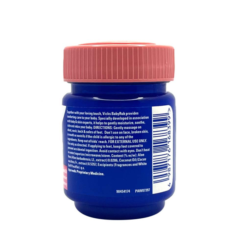 Vicks BabyRub is a specially developed product designed to gently moisturize, soothe, and relax babies. It contains Aloe Vera, Coconut Oil, and White Soft Paraffin, with Lavender & Rosemary fragrances for calming and relaxing effects. Suitable for babies 3 months and above, it is applied on chest, neck, back, and soles of feet. With millions of packs sold worldwide, Vicks BabyRub is trusted by moms worldwide.