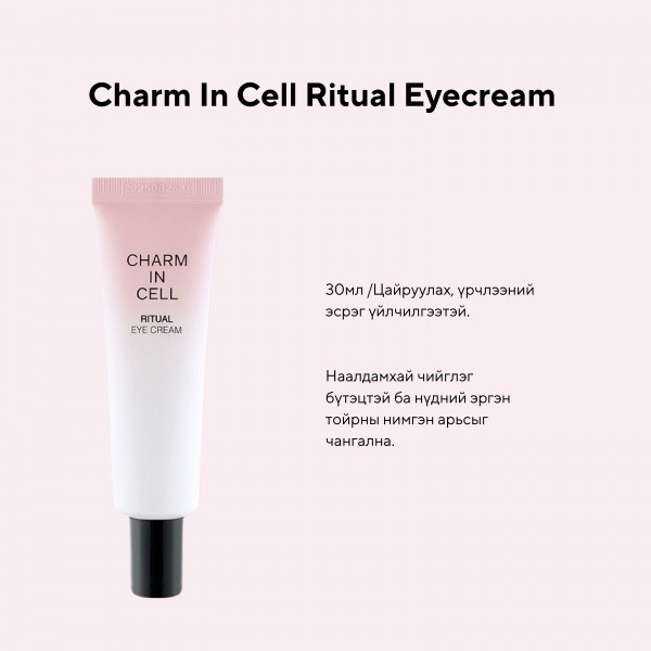 Charm in Cell Ritual Eye Cream is a repairing and soothing eye cream. The thick sticky texture of the cream gives rich nutrition and adheres thinly to the skin, making the skin texture smooth and moist.