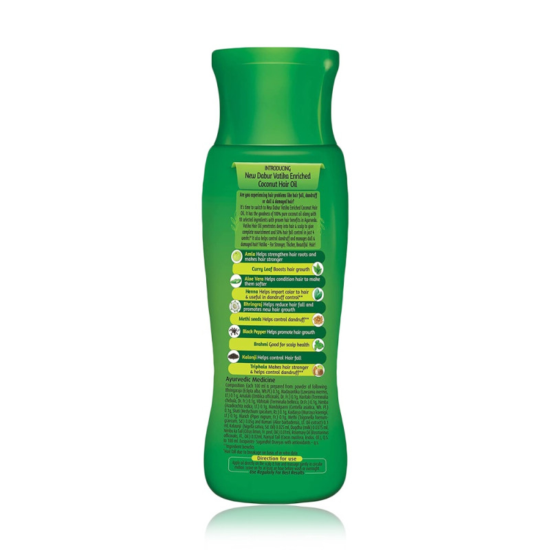 Along with the goodness of coconut, the New Vatika Enriched Coconut Hair Oil is enhanced with seven ayurvedic herbs: Amla, Brahmi, Henna, Kapur, Lemon, Bahera, and Harar. Processed by Tel Pak Vidhi, only Vatika coconut hair oil has been clinically shown to reduce hair fall by up to 50% in just four weeks. It also helps to strengthen hair from root to tip and rejuvenate scalp health.