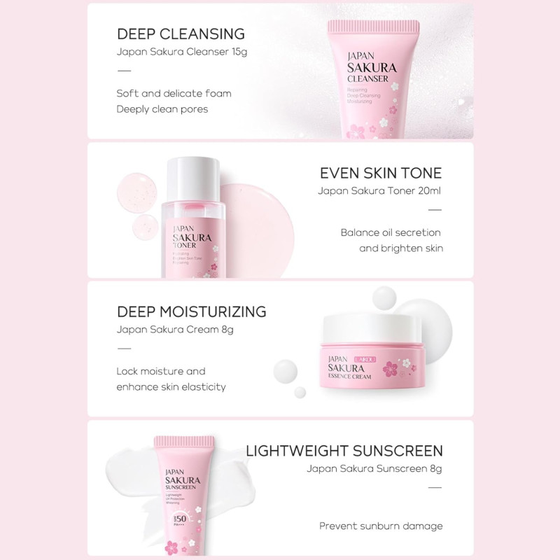 - Japan Sakura Face Care Set of 4: Immerse yourself in the beauty of Japan's sakura blossoms with our exclusive face care set. This 4-piece set includes a cleanser, toner, cream, and sunscreen infused with the essence of sakura. Experience the rejuvenating and brightening effects of sakura extract as it nourishes and revitalizes your skin, leaving you with a youthful and radiant complexion.
