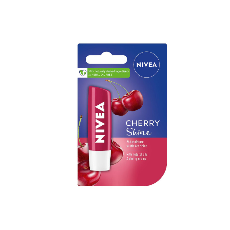 NIVEA Cherry Shine Caring Lip Balm Soft lips with cherry aroma and a hint of colour. Enriched with Shea Butter and Panthenol, it effectively protects your lips from drying out for a 12 hour period. It leaves you leaving you with soft and smooth lips. Healthy Looking Lip.