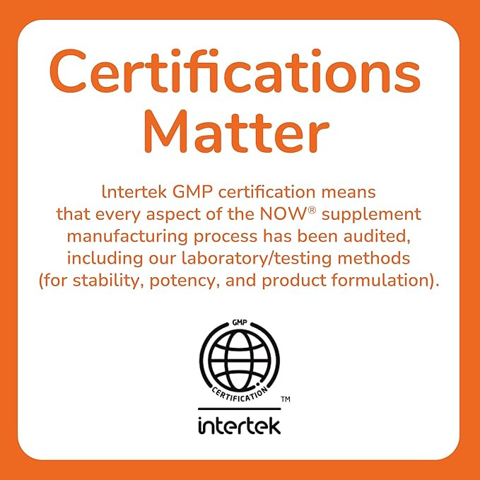 GMP Quality Assured: NPA A-rated GMP certification means that every aspect of the NOW manufacturing process has been examined, including our laboratory/testing methods (for stability, potency, and product formulation).