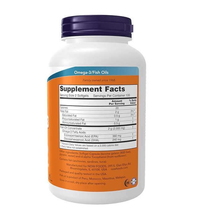 NOW Omega-3 1,000 mg softgels are made of natural fish oil concentrate manufactured under strict quality control standards. This supplement is tested to be free of potentially harmful levels of contaminants such as PCBs, dioxins, mercury, and other heavy metals. Take 2 softgels twice daily with food.