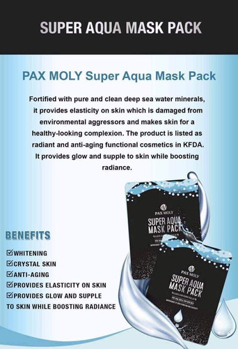 PAX MOLY's Super Aqua Mask Pack. facial mask. It was set on a delicate sheet that was completely saturated with beneficial active substances, such as sea salt, adenosine Asiatica, extracts from day flowers, and Centifolia rose. Effectively and persistently firms, moisturizes, minimizes the appearance of wrinkles, and slows down the aging process. It also regenerates the skin and gives it a radiant, healthy appearance. There is one mask in the packet.