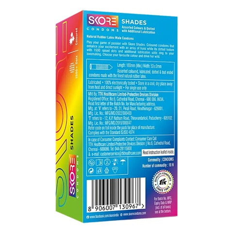 Pack Size: 10Pcs Pack Made In India Size: The girth of 53 mm +/-2mm and length of 180mm Play your game of passion with SKORE Shades. Condoms that come to you in a assortment of colours. And are 1500+ dotted to add greater sensation to lovemaking. So, choose your favourite colour and drive her wild with pleasure. Now feel and experience more sensation with every single pulsating movement of your lovemaking. The Condoms work excellently, leaving your partner thoroughly satisfied. These condoms are designed to bring new levels of excitement in the bedroom. Electronically Tested Quality product for Pleasure and Protection The condoms feature improved grip for a better fit and seamless experience DISCREET DELIVERY: Delivered in discreet packaging with no identification of the items inside the package INDIA’S NO.1 CONDOM rubber condoms by Skore provide a better fit to unveil your wild side during sex